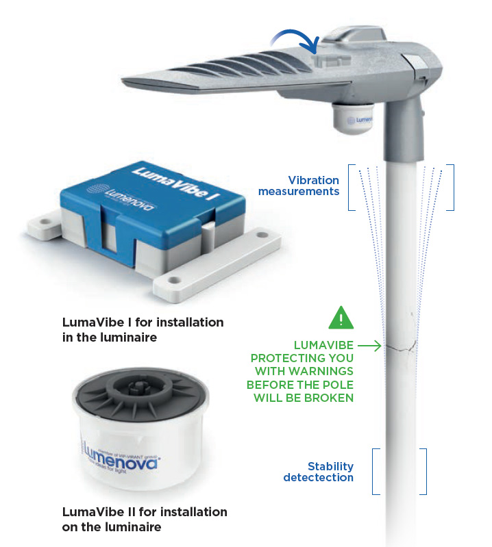 The monitoring of the masts base of an accredited procedure that has been tried and tested over many years and has been validated many times. The accelerometer integrated in the luminaire is designed as a sleeper and is woken up at certain frequencies triggered by the wind in order to measure the stability at the time of the excitation. As long as the results are within the normal range, no measurement data will be transmitted to the operator or agent.
